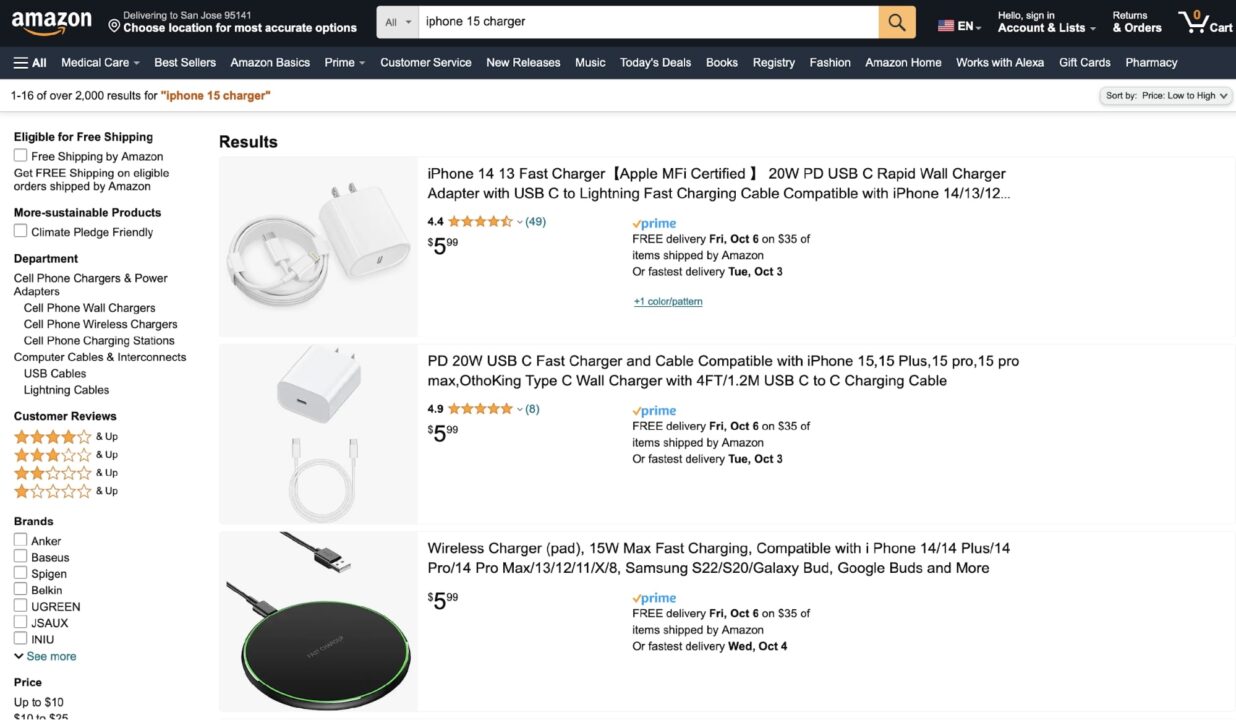 However, if you want to sort the results according to the price, you must use this URL: https://www.amazon.com/s?k=iphone+15+charger&s=price-asc-rank.