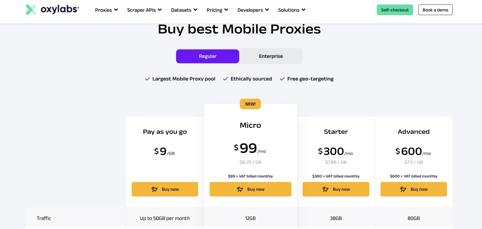 | Oxylabs | 4.6 | Largest IP pool | No | $99/month – 12GB |