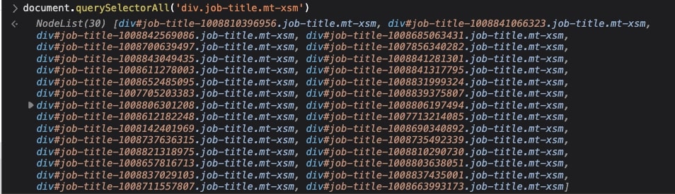 Nice, that worked! As you can see, it returns a total of 30 nodes, and as we hover over them, they highlight the company’s name on each card. Plus, now we know there are 30 jobs per page 😉.